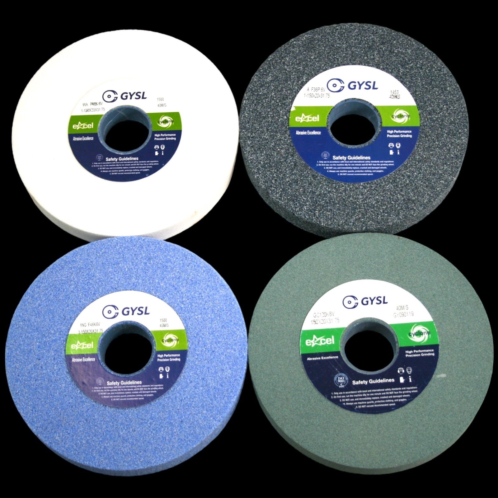 Our "Cyclone" bench and pedestal wheels are available in four main grain types, aluminium oxide for general purpose grinding, green silicon carbide for tool sharpening, white aluminium oxide for more precise work and low percentage ceramic for difficult to grind materials and extreme cool cutting.