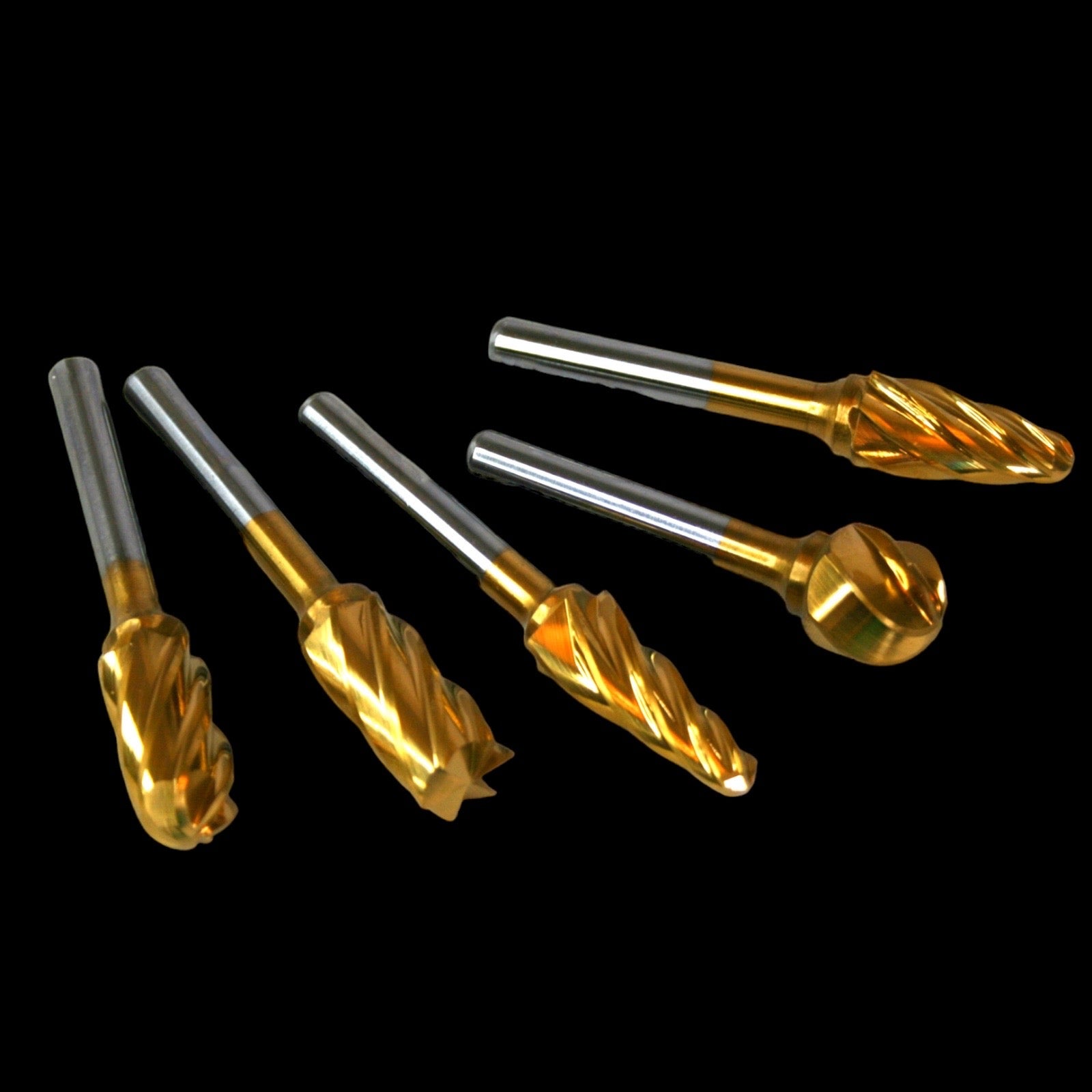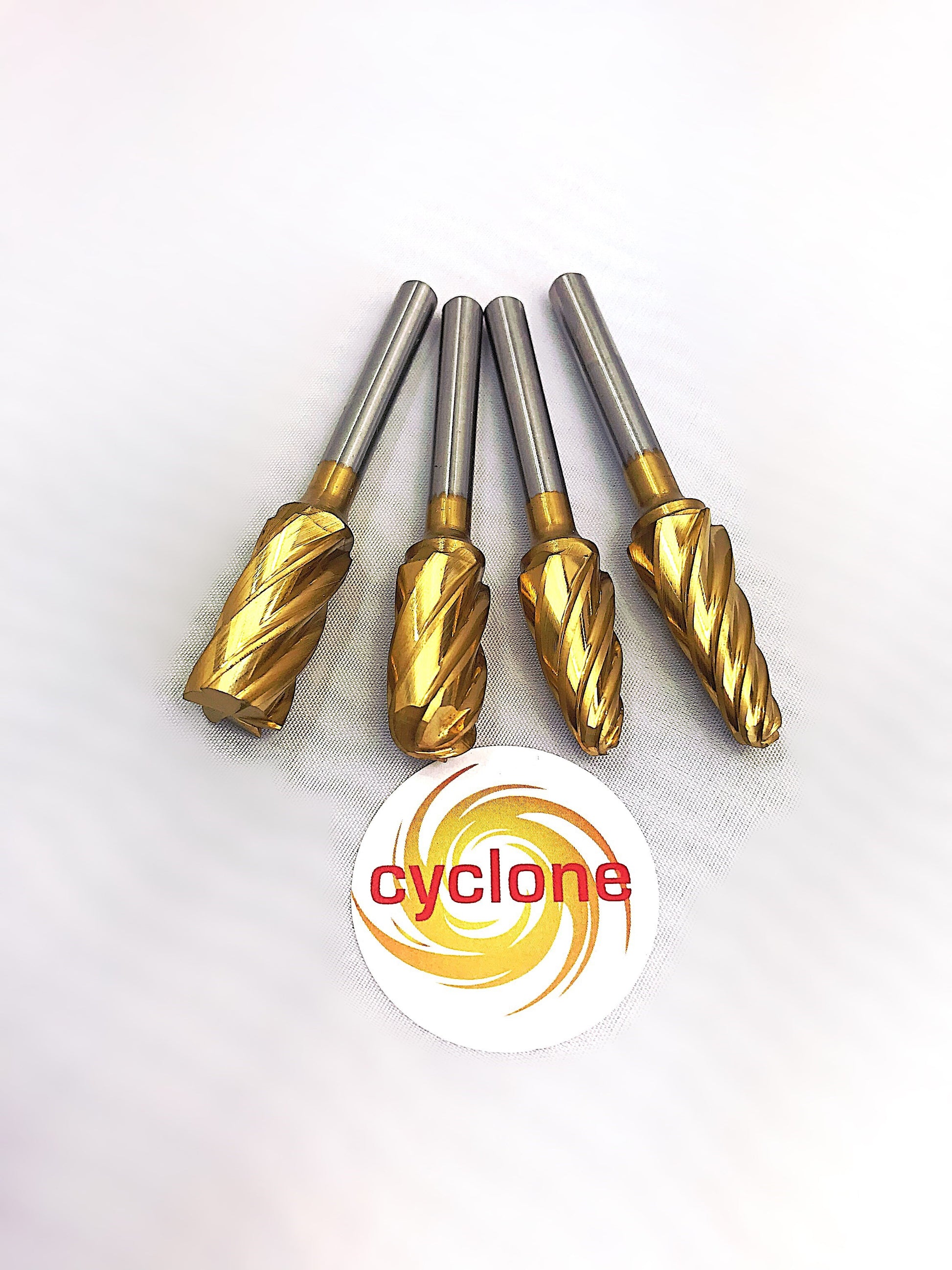 Our special Titanium Nitride Gold carbide burrs offer the ultimate performance when working with aluminium and other non-ferrous metal. The coating helps protect the cutting edge meaning the burr stays sharper for longer. It also helps to act as a lubricant preventing the burr from clogging up. The special 6 flute geometry provides effective chip removal and optimal stock removal. They are available in five different shapes as listed below.
